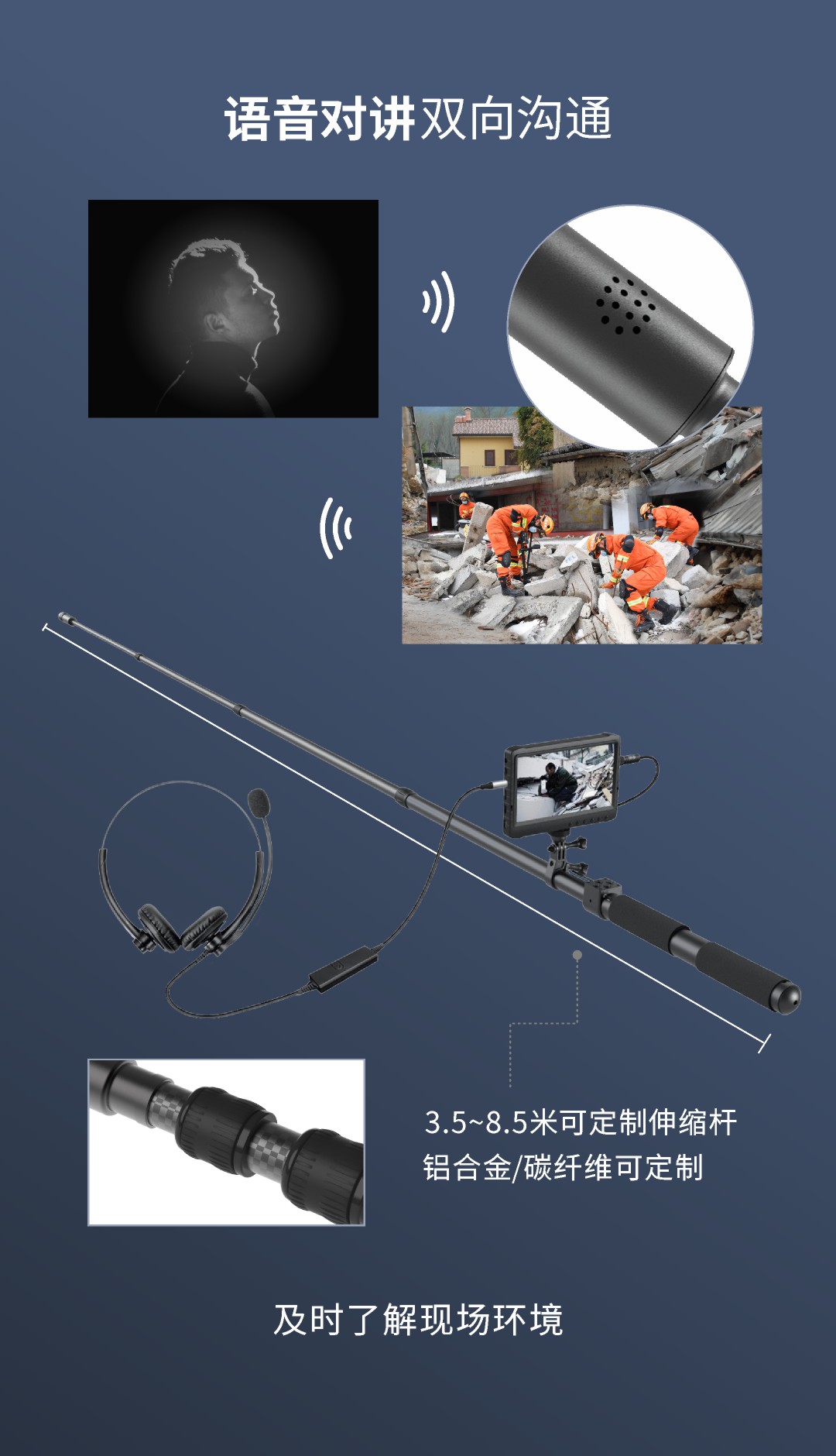 優(yōu)勢特點(diǎn):360°旋轉(zhuǎn)攝像頭;可監(jiān)聽雙向?qū)χv;可伸縮調(diào)節(jié)桿;6小時(shí)超長續(xù)航