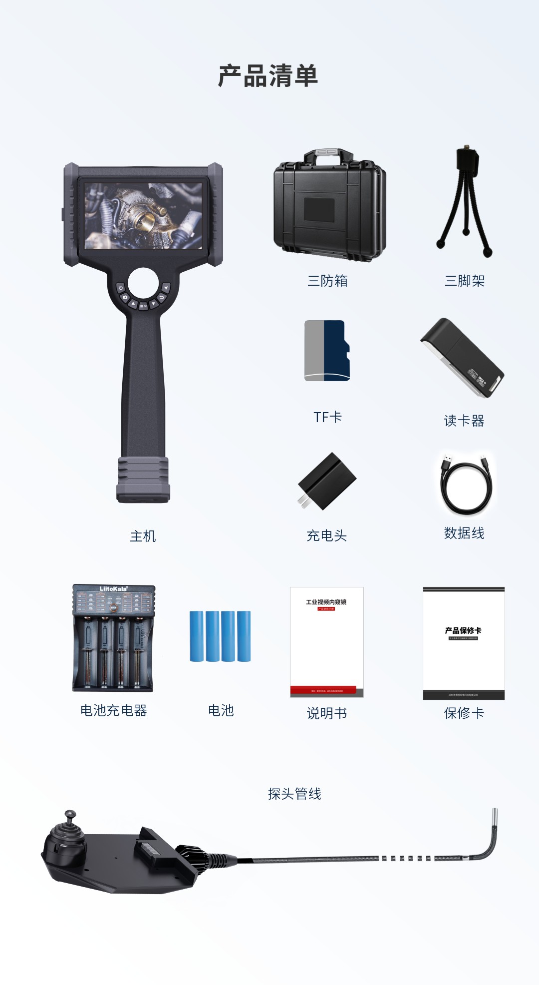 優(yōu)勢特點:6英寸高清觸摸屏、快速更換管線、360°全方向擺頭、后置LED光纖導(dǎo)光、18650電池,工作時長≥8