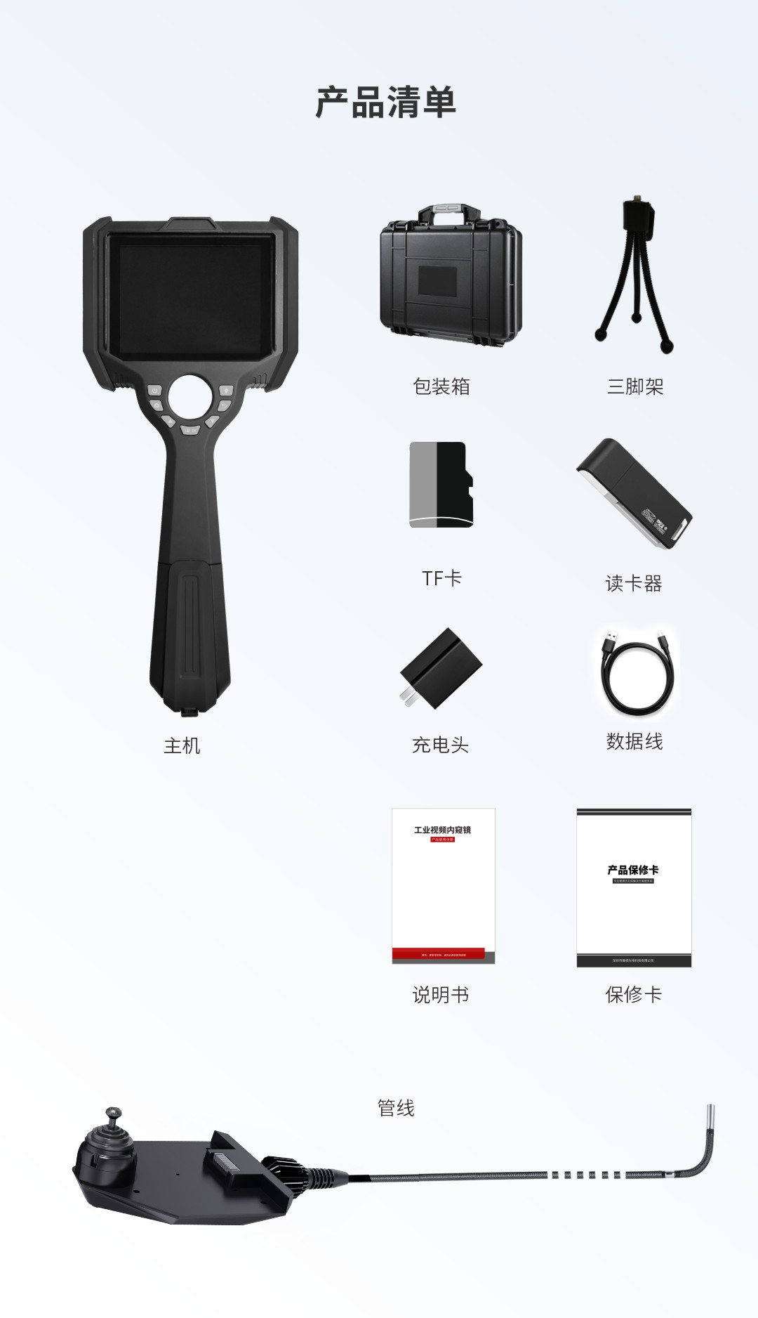 優(yōu)勢特點(diǎn):紅白雙光源一鍵切換;攝像頭拾音、錄音功能;探頭360°轉(zhuǎn)向;可更換不同類型管線;